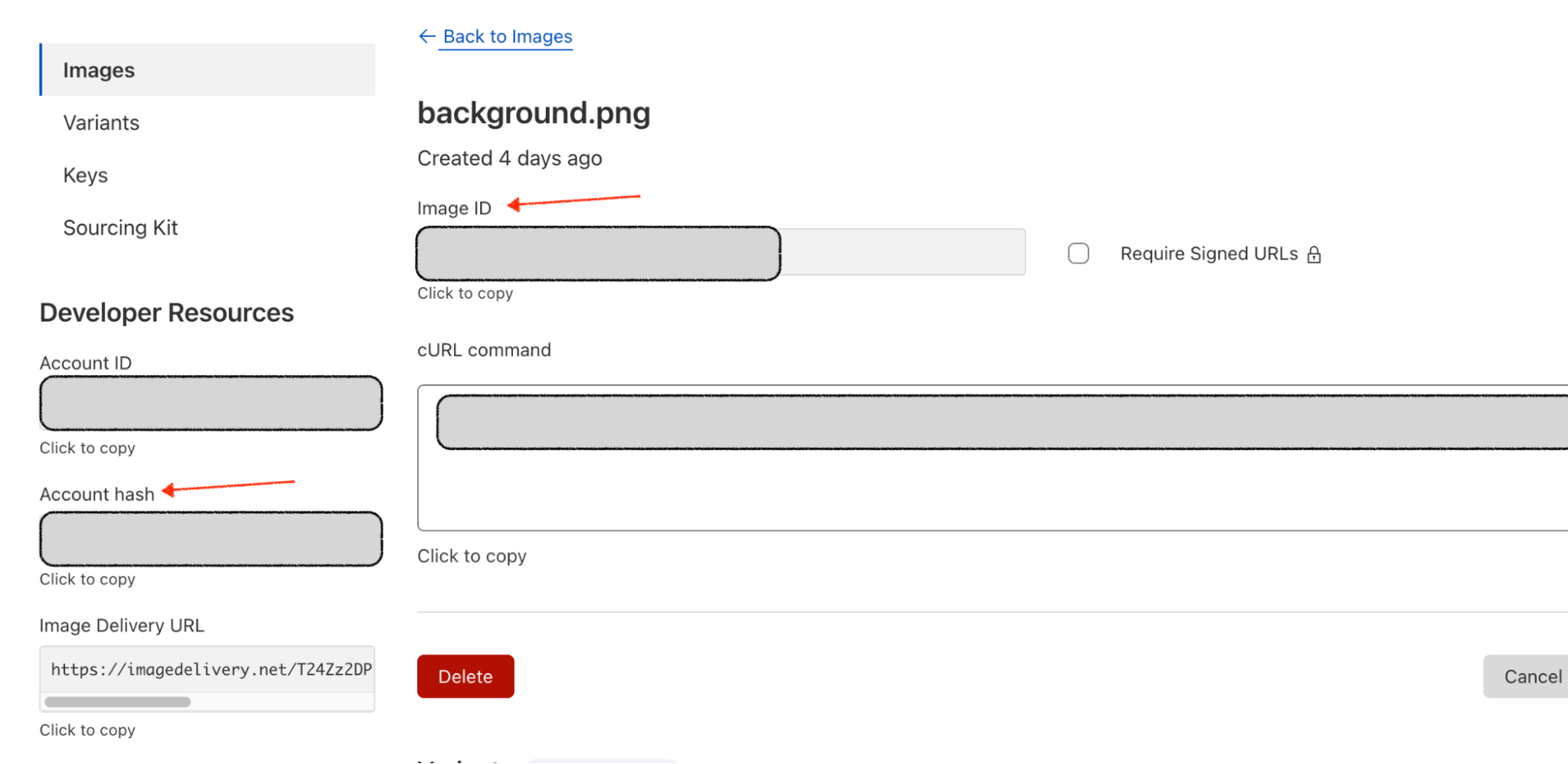 Where the env.CLOUDFLARE_ACCOUNT_HASH is your Cloudflare Account Id and the env.IMAGE_ID is the image id you got from the Cloudflare’s dashboard.